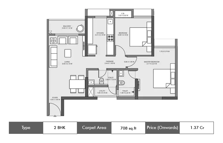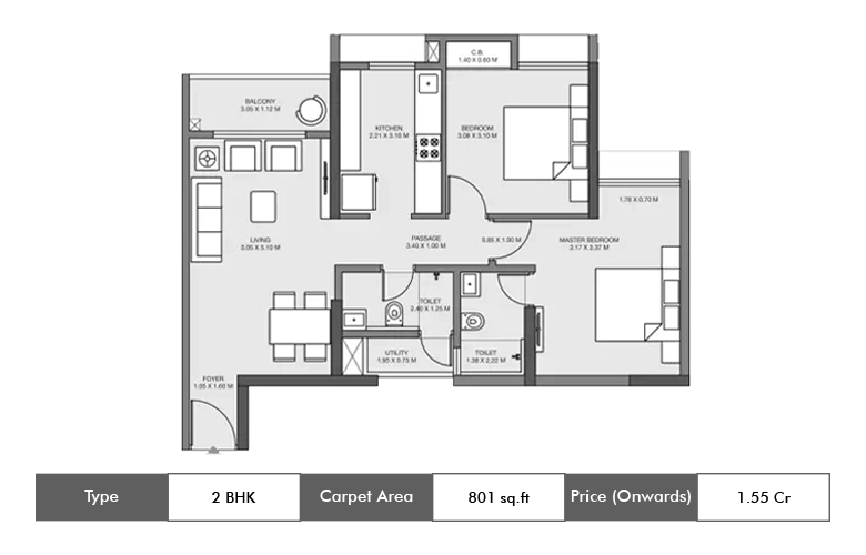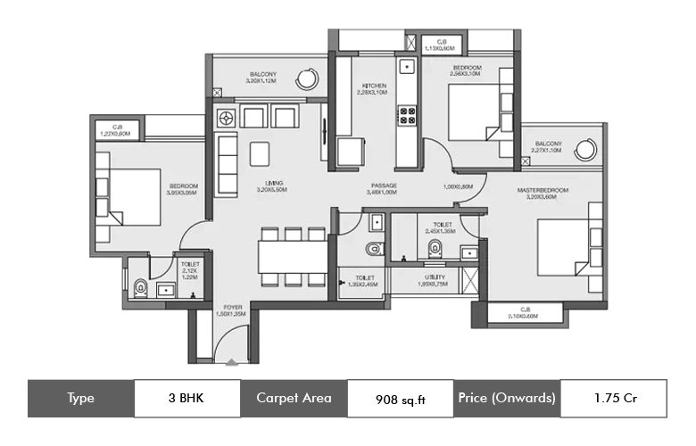 | 3 BHK | 1850 Sq. ft. (Carpet Area) | 1.10 Cr Onwards |